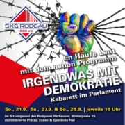 Dieses Mal geht’s um Rodgau und um Weltpolitik, Wahnsinn und alles dazwischen, eben getreu dem neuen Programm „Irgendwas mit Demokratie“. In der Pause werden Snacks und Getränke gereicht – alles im Eintrittspreis inbegriffen – jeweils um 18 Uhr im Rathaus in Jügesheim. Tickets gibt’s online unter www.skgrodgau.de unter Tickets.