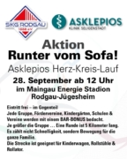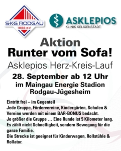 Am Sonntag, den 28. September kehrt die gemeinsame Aktion mit der Asklepios Klink Seligenstadt „Runter vom Sofa“ zurück ins Maingau-Energie-Stadion. Jeder Verein, jede Schule, und jedes unserer eigenen Teams kann mitmachen, es gibt für jeden Teilnehmer*in eine Geldprämie für’s Team. Auch Eltern, Geschwister, Großeltern und Freunde können für euer Team mitlaufen!