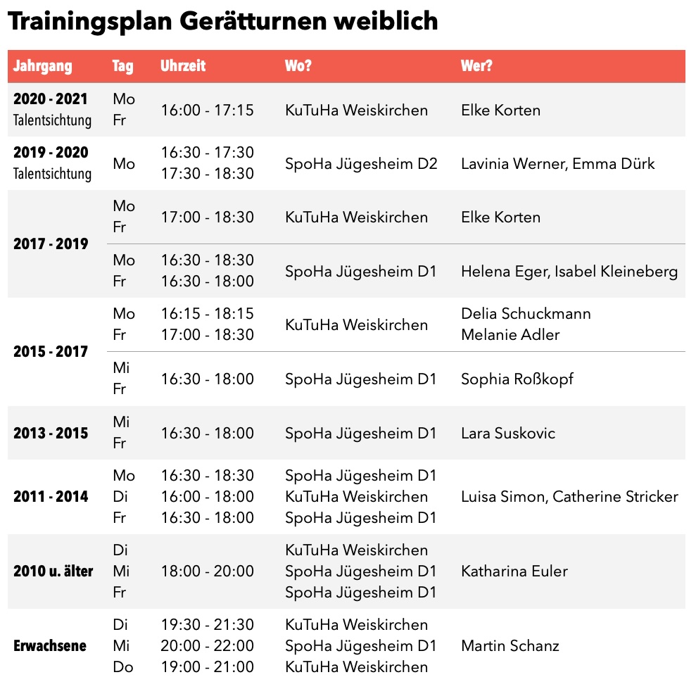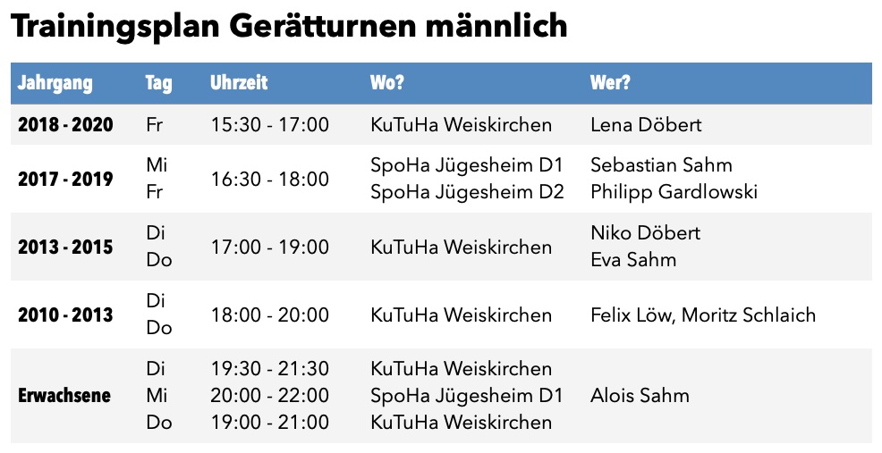 Gerätturnen oder umgangssprachlich oft auch Geräteturnen ist eine Einzel- und Mannschafts-sportart, bei der an verschiedenen Geräten entweder vorgegebene Übungen geturnt werden oder eine Kür nach verschiedenen Vorgaben zusammengestellt und präsentiert wird. Besonderer Wert wird hierbei auf korrekte Technik und Haltung gelegt, die vom Kampfgericht bewertet wird. Neben der Entwicklung koordinativer und konditioneller Fähigkeiten geht es beim Turnen auch darum, Mut und Selbstbeherrschung zu zeigen und zu fördern. Nicht zu vergessen, auch der Teamgeist bei Mannschaftswettkämpfen und besonders auch im Training spielt bei uns eine entscheidende Rolle!