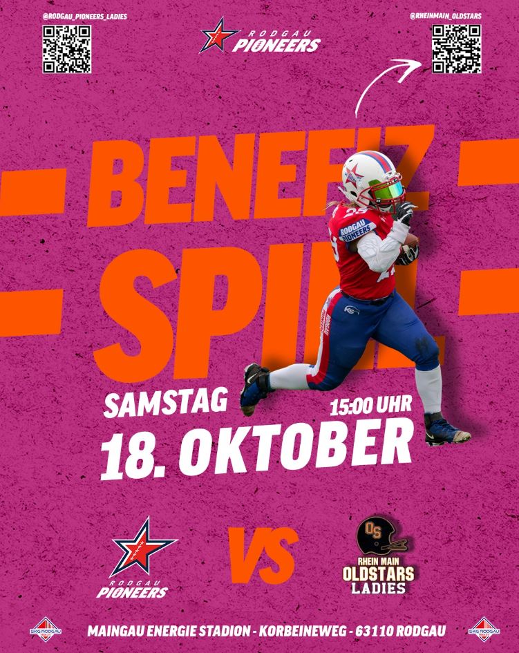 Nach dem erfolgreichen 24-Stunden-Lauf steht das nächste Benefiz-Event bei uns an: Unsere Rodgau Pioneers Ladies aus der 2. Football-Bundesliga spielen am Samstag, den 18.10.25 im Maingau-Energie-Stadion gegen die Rhein Main Old Stars Ladies.