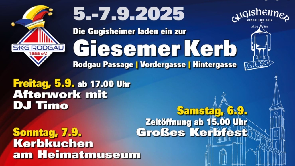Unsere Gugisheimer aus der Abteilung Fassenacht laden ein zur Giesemer Kerb rund um die Jügesheimer Kirche am 5., 6. und 7. September 2025.