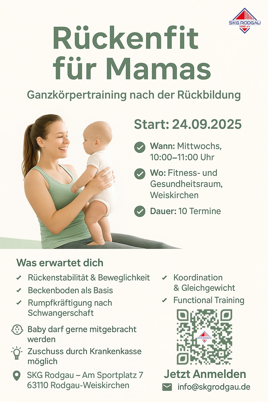 Am 24. September 2025 startet der neue RückenFit Mama Kurs in Rodgau-Weiskirchen. Der Kurs richtet sich an Mütter nach der Rückbildung, die aktiv etwas für ihren Rücken, den Beckenboden und die Rumpfmuskulatur tun möchten.
