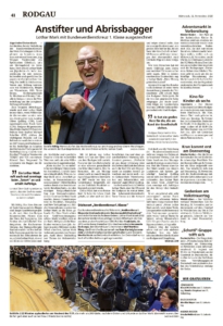 In gewohnter Manier hat er es sich nicht nehmen lassen, am Ende seiner Rede auf die Wichtigkeit seiner Broschüre hinzuweisen, die auf jedem Platz im Saal auslag. Dabei hat er gleich klargestellt, dass die Rückseite die wichtigste ist: Die Spendenkontoliste seiner Vereine und Stiftungen. Er beendete seine Rede mit den Worten „lasst euch nicht lumpen“. Es wurde viel gelacht – bei Lothars Reden ist dies allerdings immer absehbar. Die Kombination aus Charme, Humor und knallharter Verhandlungstaktik gelingt kaum einem anderen in der hessischen Mundart. Dafür erhielt er Standing Ovations der geladenen Gäste.